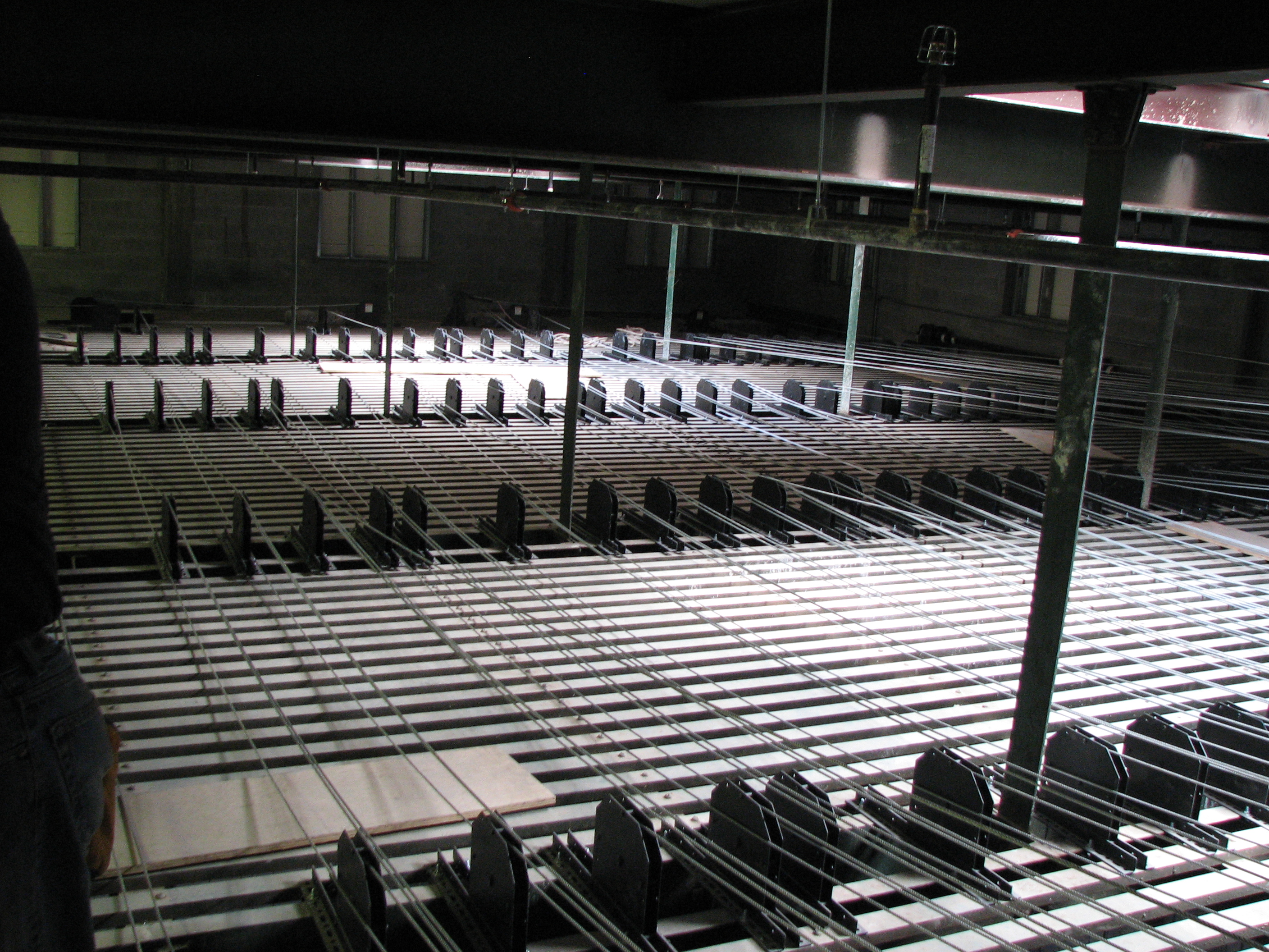 Project included (32) Single Purchase Counterweight Linesets 6” OC, (5) dedicated electric battens, pyro activated fire curtain, soft goods package, stage riser kit, roll up movie screen, and a flown 3 piece Orchestra Shell with removeable US wall panels.